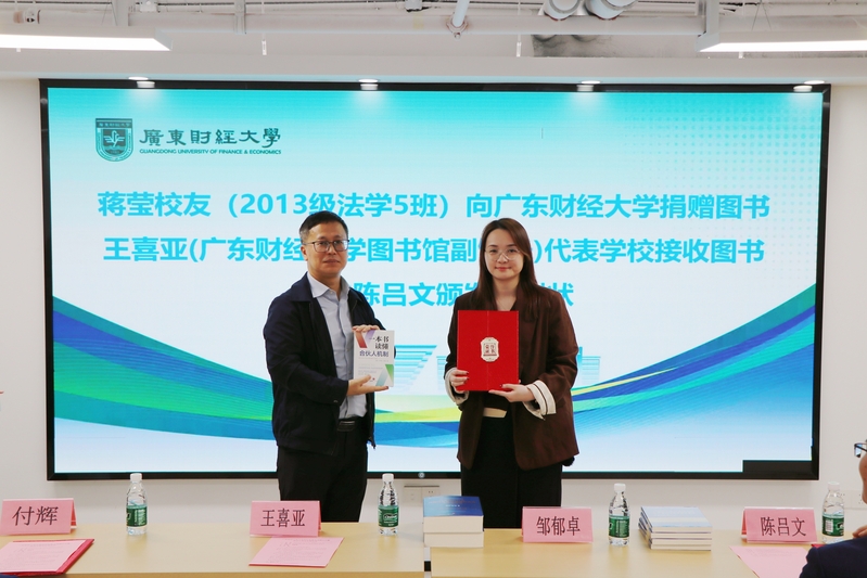 2003级法学1班校友陈吕文、2004级宪法学与行政法学1班校友付辉、2013级法学5班校友蒋莹分别向图书馆捐赠了个人专著。王喜亚副馆长代表图书馆接受赠书,并向三位校友颁发捐赠证书,以感谢他们对图书馆馆藏资源和校友文库建设的大力支持。