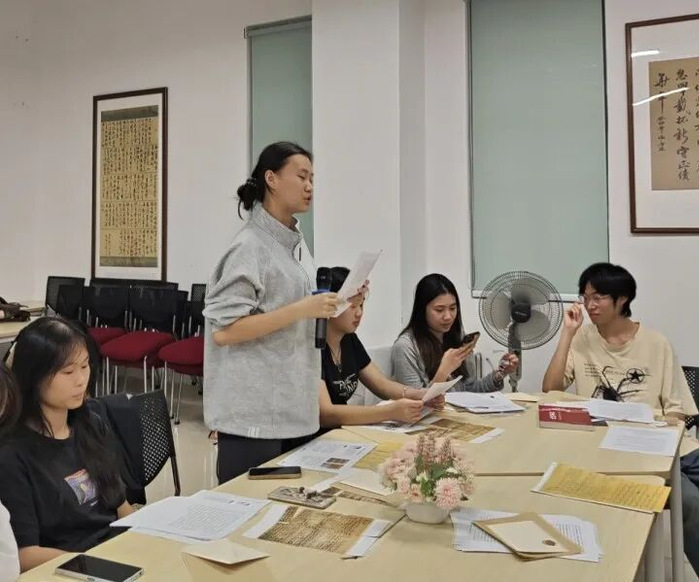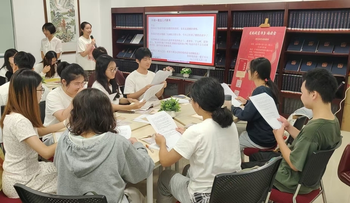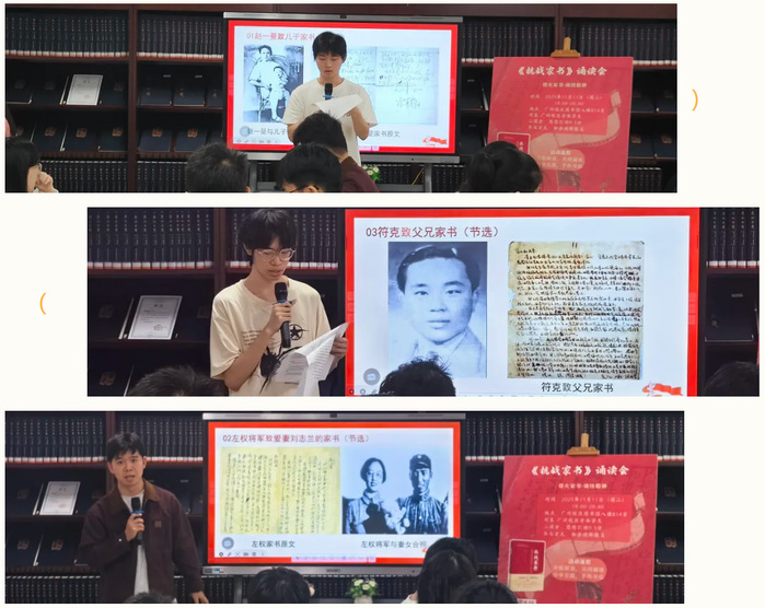 活动伊始,主持人、图学委干部陈品汝通过介绍《抗战家书》的时代背景、历史价值和播放央视纪录片《家书——四万万人的抗战记忆》片段,将同学们带回到那个风雨如晦的年代。在随后的分组研读中,同学们在领读员詹锦波、张嘉琪和杨树鹏的带领下,深入研读了赵一曼、左权、符克三位英烈的家书。泛黄的纸页和深情的笔墨,让先烈们的形象愈发清晰。